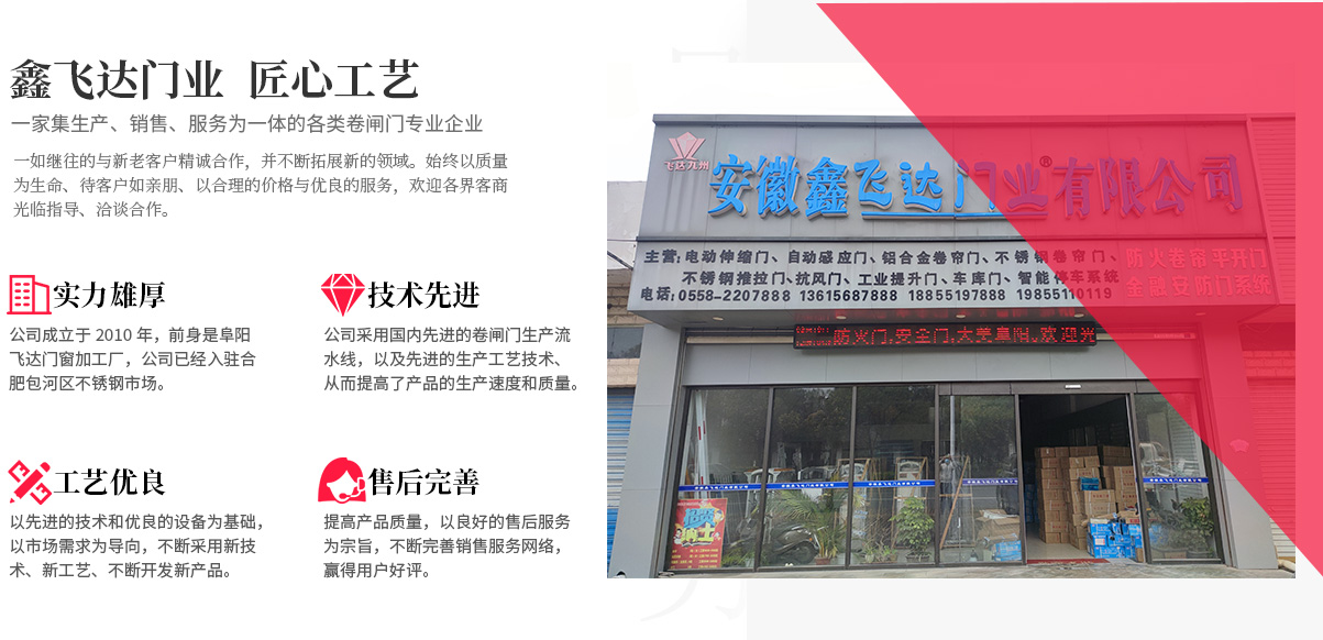 - 安徽鑫飛達門業有限公司成立于1998年,前身是阜陽飛達門窗加工廠,現在公司已經入駐合肥包河區不銹鋼市場。本公司是一家集生產、銷售、服務為一體的各類卷閘門專業企業。公司采用國內先進的卷閘門生產流水線,以及先進的生產工藝技術、從而提高了產品的生產速度和質量。旗下擁有飛達九州和飛達門業兩個注冊商標。 產品種類齊全 ,質量可靠,主要有不銹鋼推拉門,防火卷簾門,電動卷...